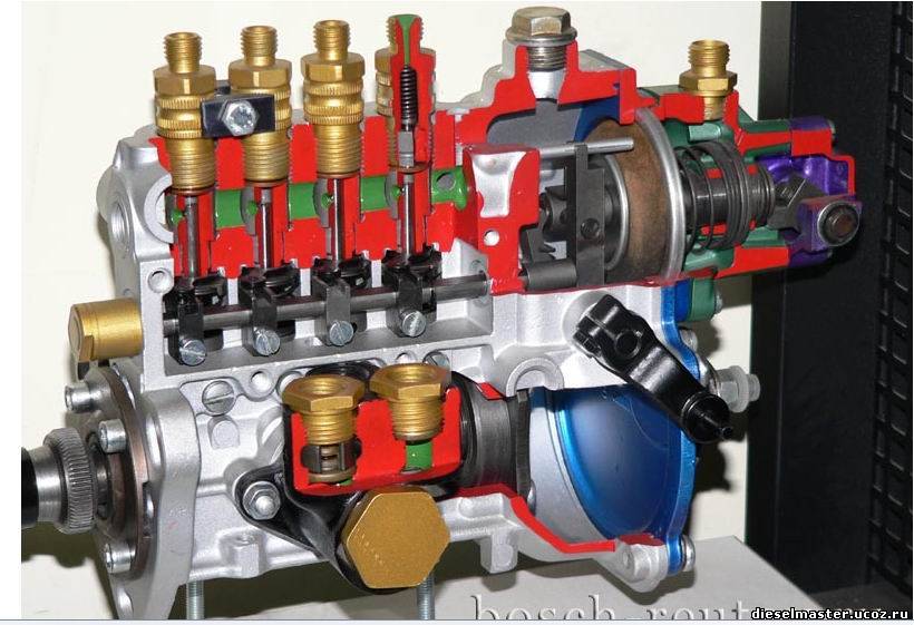 По своему устройству единичные секции абсолютно одинаковы. Эти приборы устанавливались ранее на дизельных двигателях и работали по жесткой программе от газораспределительного механизма (ГРМ) двигателя. - Распределительный одноплунжерный насос — работает также синхронно с вращением коленчатого вала. На 4-тактном двигателе рабочий процесс происходит за 2 оборота коленвала. Насосный вал в это время совершит 1 оборот, а рабочий плунжер подаст очередную порцию топлива на каждую форсунку. Распределительные насосы чаще всего используются в моторах легковых автомобилей.