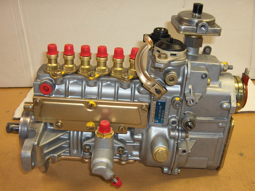 Несмотря на возраст конструкции, рядные насосы до сих пор используются на дизельных двигателях грузовых автомобилей. Это вызвано их высокой надежностью и неприхотливостью в отношении качества топлива. В качестве примера показан ТНВД 8-цилиндрового двигателя автомобиля КАМАЗ. Для сокращения осевых габаритов он выполнен V-образным, хотя все равно является рядным.