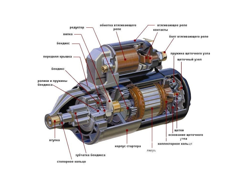 Автомобильный стартер представляет собой устройство, состоящее из двигателя постоянного тока, механизма сцепления-расцепления, редуктора и системы управления. Механизм сцепления-расцепления и редуктор обычно называют приводом стартера.