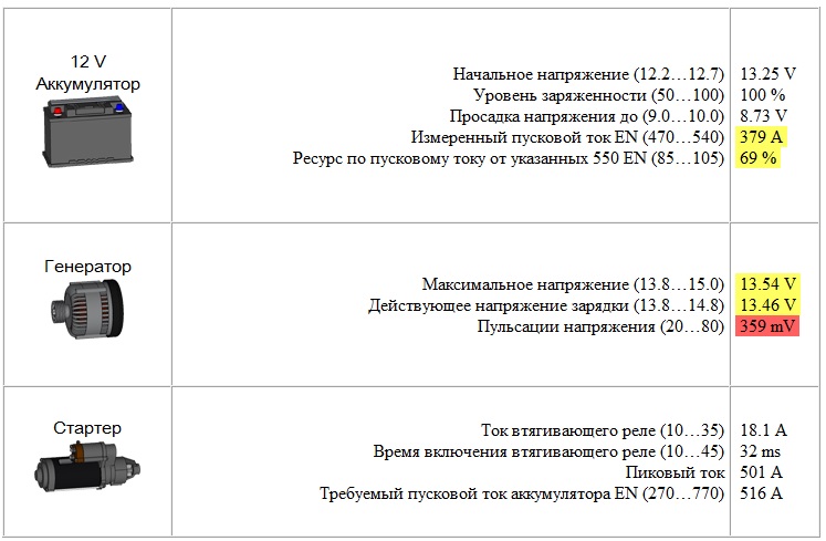 Транспортные средства с системами на 6 В будут иметь примерно такое же напряжение, как в примере, если аккумулятор имеет достаточный ток запуска и кабели имеют достаточно низкое сопротивление. Транспортные средства с 12-вольтовой системой будут иметь примерно вдвое большее напряжение, чем в примере, при условии, что батареи и кабели в норме, то есть напряжение заблокированного ротора составляет около 6.3 вольта и напряжение пуска от 9 до 10 вольт.