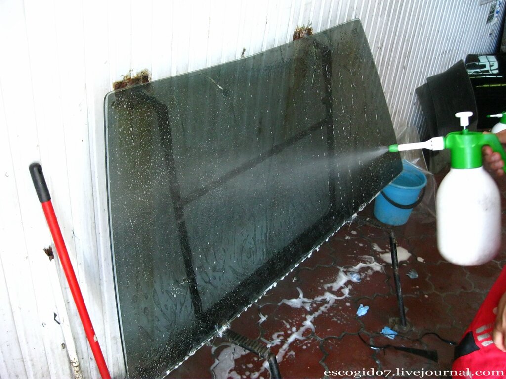 - Перейдя внутрь, подготовьте стекло, сбрызнув его мыльной водой.