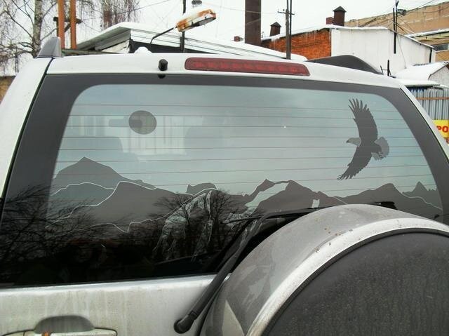 Недостатком же является то, что тонировка с изображением уменьшает обзор, и, соответственно, это может снизить комфортность вождения. Поэтому мы рекомендуем боковые стекла украшать небольшими компактными изображениями в уголках, а основной рисунок размещать на заднем стекле, где он практически не будет мешать и всем будет виден.