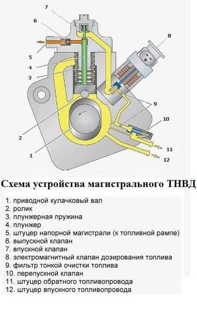 На рисунке показана схема топливного насоса магистрального типа. Чаще всего такие устройства применяются в системах Common Rail.