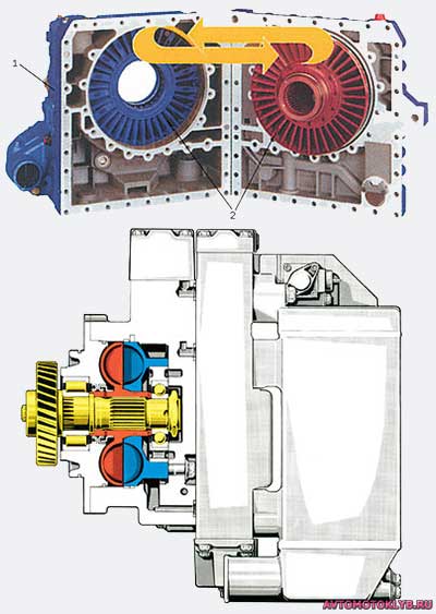 Ретардер включает в себя статор и 2 ротора (2 диска с крыльчаткой, которые соединены с карданными валами вращающими их). Находятся рядом друг с другом.