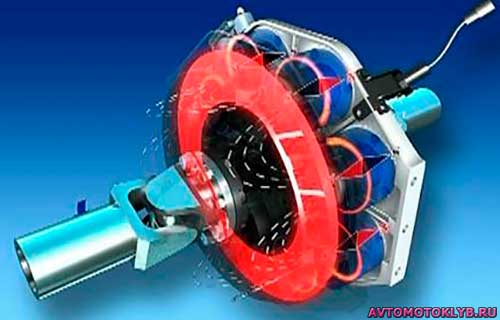 Статор является индуктором и включает в себя 2 электромагнитных соединений. Благодаря ним возникает электромагнитное поле, оно то и формирует вихревые замкнутые электротоки (токи Фуко). Роторы являются в свою очередь компонентами, из-за которых появляется торможение – они созданы из токопроводимых материалов, по этой причине они играют роль якоря. Появляются вихревые токи в случае вращательного процесса роторов при помощи карданного вала в магнитном поле, который создает статор.