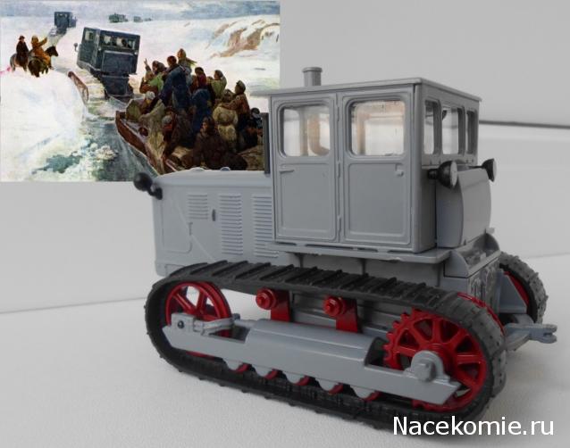 балкой, представляющей собой переднюю опору двигателя. На трактор устанавливается четырехтактный бескомпрессорный предкамерный дизель КДМ-100 высокого сжатия. Для запуска дизеля используется двухцилиндровый двигатель марки П-46. Муфта сцепления — сухая с одним ведущим и двумя ведомыми дисками и рычажно-кулачковым нажимным устройством. Муфта сцепления выполнена в виде самостоятельного легкосъемного узла. При установке она присоединяется к маховику коленчатого вала двигателя и к верхнему ведущему валу коробки передач. Управление муфтой сцепления осуществляется рычагом управления. Коробка передач трехходовая, реверсивная, имеет пять передач переднего хода и четыре передачи заднего хода. Центральная передача — коническая; ведущая шестерня выполнена заодно с нижним валом коробки передач; ведомая шестерня крепится к фланцу вала центральной передачи. ![]() Муфты поворота — сухие, многодисковые. Ведомые диски снабжены фрикционными накладками. Управление фрикционами осуществляется при помощи рычагов и сервомеханизма. Тормоза ленточные, с фрикционными накладками. Управление тормозами осуществляется при помощи педалей. Конечная передача — двухступенчатая, с цилиндрическими шестернями с прямым зубом. Ходовая часть тракторов — полужесткого типа, состоит из двух гусеничных тележек, гусениц и балансирного устройства. Гусеничная тележка — сварная, с рамой коробчатого сечения, имеет опорные и поддерживающие катки, натяжное приспособление и натяжное колесо. Гусеницы состоят из звеньев, соединенных шарнирно при помощи пальцев и втулок. К звеньям гусениц крепятся башмаки специального профиля. Балансирное устройство представляет собой поперечную пластинчатую рессору с двумя малыми стабилизирующими рессорами.