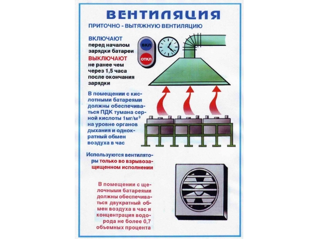 136. В аккумуляторном помещении приточно-вытяжная вентиляция должна включаться перед началом зарядки аккумуляторных батарей и отключаться не ранее чем через 1,5 часа после окончания зарядки.