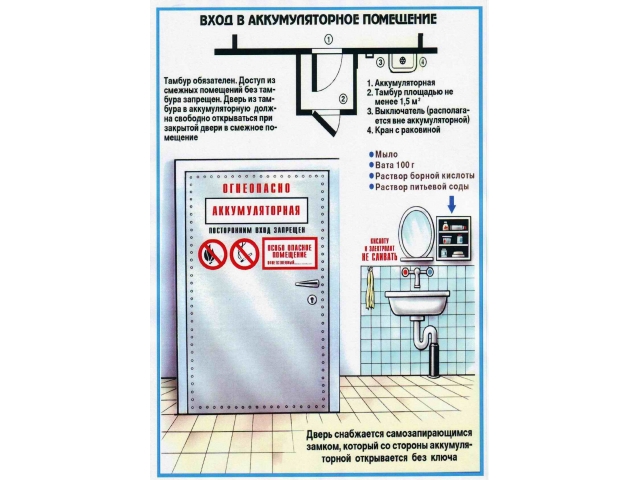 В помещении для зарядки аккумуляторов также целесообразно обеспечить внедрение следующих мер: