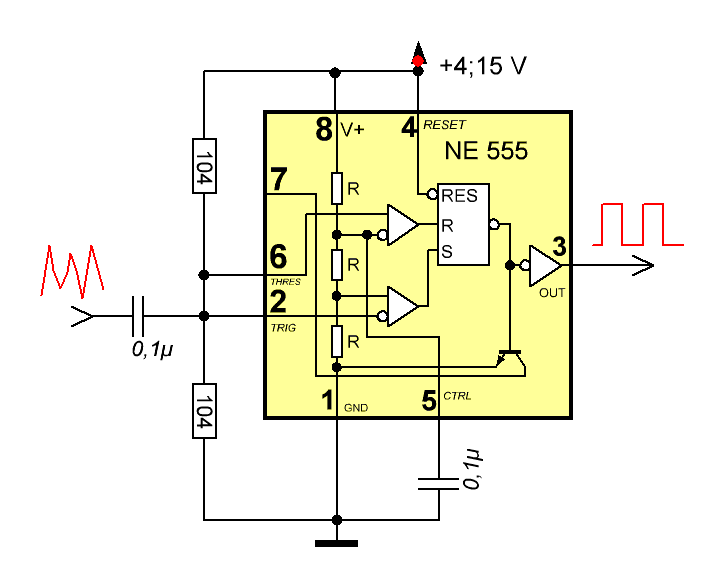 На вход может поступать аналоговый сигнал сложной формы. При достижении определённого порога на входе триггер переключается из одного состояния в другое.
