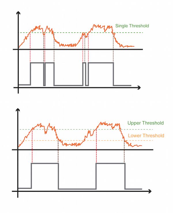 Π€ΠΎΡΠΌΠ° Π²ΡΡ ΠΎΠ΄Π½ΠΎΠ³ΠΎ ΡΠΈΠ³Π½Π°Π»Π° Π² ΠΏΡΠΈΠ²Π΅Π΄Π΅Π½Π½ΠΎΠΉ Π²ΡΡΠ΅ ΡΡ Π΅ΠΌΠ΅ ΠΏΠΎΠΊΠ°Π·Π°Π½Π° Π½ΠΈΠΆΠ΅. ΠΠ° ΡΡΠΎΠΉ ΠΎΡΡΠΈΠ»Π»ΠΎΠ³ΡΠ°ΠΌΠΌΠ΅ ΠΌΡ ΠΌΠΎΠΆΠ΅ΠΌ Π²ΠΈΠ΄Π΅ΡΡ ΡΡΠ°Π²Π½Π΅Π½ΠΈΠ΅ ΡΠ»ΡΡΠ°Π΅Π² Ρ Π³ΠΈΡΡΠ΅ΡΠ΅Π·ΠΈΡΠΎΠΌ ΠΈ Π±Π΅Π· Π½Π΅Π³ΠΎ. Π ΡΠ»ΡΡΠ°Π΅ ΡΠΈΠ³Π½Π°Π»Π° Π±Π΅Π· Π³ΠΈΡΡΠ΅ΡΠ΅Π·ΠΈΡΠ° ΡΡΠΌ Π½Π° Π²Ρ ΠΎΠ΄Π΅ Π²ΡΠ·ΠΎΠ²Π΅Ρ ΡΠΊΠ°ΡΠΊΠΈ Π²ΡΡ ΠΎΠ΄Π½ΠΎΠ³ΠΎ Π½Π°ΠΏΡΡΠΆΠ΅Π½ΠΈΡ ΠΌΠ΅ΠΆΠ΄Ρ Π·Π½Π°ΡΠ΅Π½ΠΈΡΠΌΠΈ Π½Π°ΠΏΡΡΠΆΠ΅Π½ΠΈΡ Π½Π° ΡΠΈΠ½Π΅. ΠΠΎΡ ΠΏΠΎΡΠ΅ΠΌΡ ΠΌΡ Π΄ΠΎΠ±Π°Π²Π»ΡΠ΅ΠΌ Π½Π΅ΠΊΠΎΡΠΎΡΡΠΉ Π³ΠΈΡΡΠ΅ΡΠ΅Π·ΠΈΡ Π² ΡΡ Π΅ΠΌΡ ΠΊΠΎΠΌΠΏΠ°ΡΠ°ΡΠΎΡΠ°, ΡΡΠΎΠ±Ρ ΡΠΎΠ·Π΄Π°ΡΡ ΡΡΠΈΠ³Π³Π΅Ρ Π¨ΠΌΠΈΡΡΠ°. Π‘ΠΌΠ΅ΡΠ°Ρ ΠΏΠΎΡΠΎΠ³ ΠΏΠ΅ΡΠ΅ΠΊΠ»ΡΡΠ΅Π½ΠΈΡ Π½ΠΈΠΆΠ΅ Π·Π½Π°ΡΠ΅Π½ΠΈΡ ΠΏΠ΅ΡΠ΅Π΄Π½Π΅Π³ΠΎ ΡΡΠΎΠ½ΡΠ° (ΠΈ Π½Π°ΠΎΠ±ΠΎΡΠΎΡ, Π΄Π»Ρ Π·Π°Π΄Π½Π΅Π³ΠΎ ΡΡΠΎΠ½ΡΠ°), Π½Π΅Π±ΠΎΠ»ΡΡΠΎΠΉ ΡΡΠΌ Π½Π° Π²Ρ ΠΎΠ΄Π΅ Π½Π΅ ΠΏΠΎΠ²Π»ΠΈΡΠ΅Ρ Π½Π° Π²ΡΡ ΠΎΠ΄Π½ΠΎΠ΅ Π½Π°ΠΏΡΡΠΆΠ΅Π½ΠΈΠ΅.