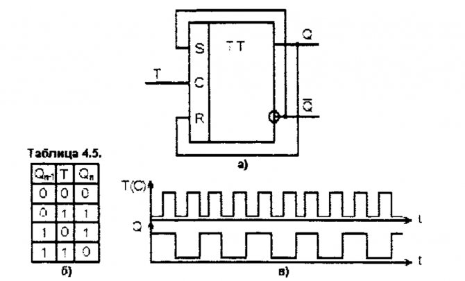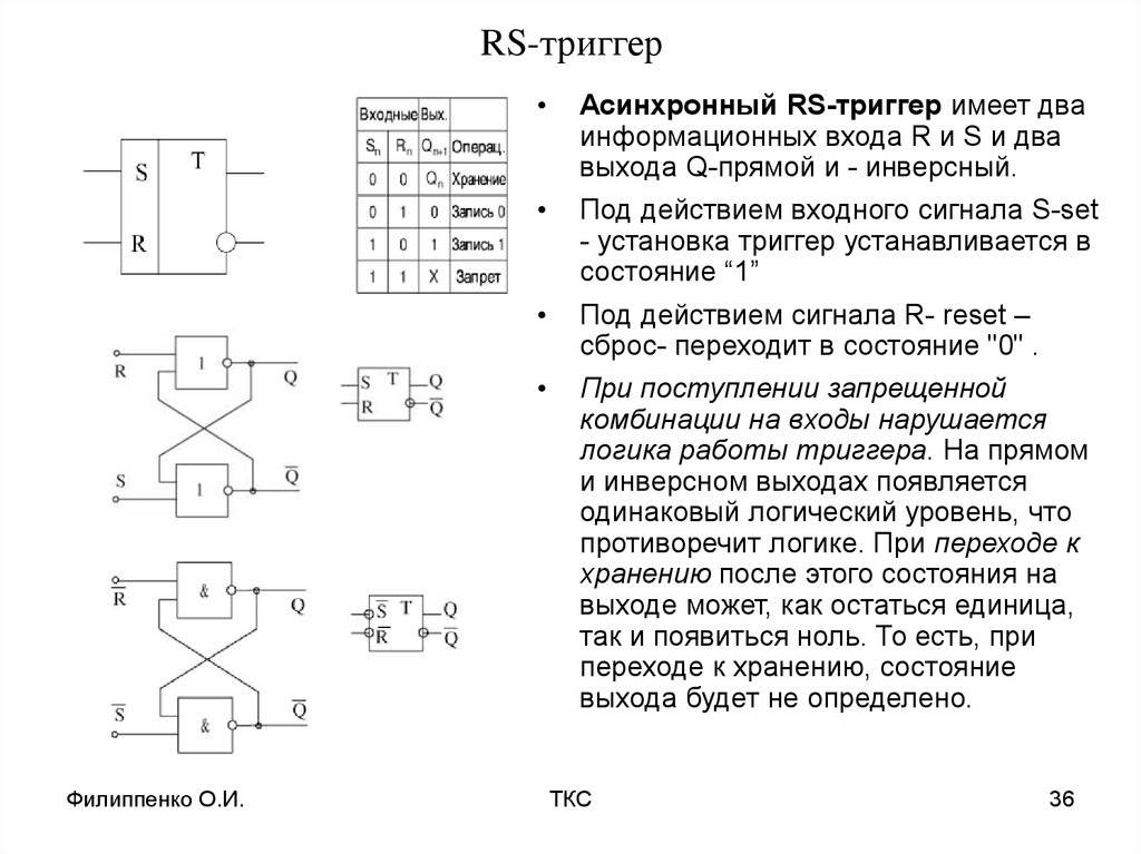 ΠΠ΄Π½ΠΎΠ²ΡΠ΅ΠΌΠ΅Π½Π½ΠΎ ΠΏΠ΅ΡΠ²ΡΠΉ ΡΡΠ°Π½Π·ΠΈΡΡΠΎΡ Π½Π°ΡΠ½ΡΡ ΡΡΠ½ΡΠΈΡΠΎΠ²Π°ΡΡ Π±Π°Π·Ρ VT2 ΠΈ ΡΠ΅Π·ΠΈΡΡΠΎΡ R4. ΠΠ»Ρ ΠΈΠ½Π²Π΅ΡΡΠΈΠΈ ΡΠΈΠ³Π½Π°Π»Π° Π½Π΅ΠΎΠ±Ρ ΠΎΠ΄ΠΈΠΌΠΎ Π½Π° Π²Ρ ΠΎΠ΄ R ΠΈΠ»ΠΈ S ΠΏΠΎΠ΄Π°ΡΡ ΠΈΠΌΠΏΡΠ»ΡΡ. ΠΡΠΎΠ±Π΅Π½Π½ΠΎΡΡΡΡ ΡΠ°Π±ΠΎΡΡ ΡΡΡΡΠΎΠΉΡΡΠ²Π° ΡΠ²Π»ΡΠ΅ΡΡΡ ΡΠΏΠΎΡΠΎΠ±Π½ΠΎΡΡΡ ΡΠ΄Π΅ΡΠΆΠΈΠ²Π°ΡΡ ΡΡΡΠ°Π½ΠΎΠ²Π»Π΅Π½Π½ΠΎΠ΅ ΡΠΎΡΡΠΎΡΠ½ΠΈΠ΅ ΠΌΠ΅ΠΆΠ΄Ρ ΠΈΠΌΠΏΡΠ»ΡΡΠ°ΠΌΠΈ R ΠΈ S, ΡΡΠΎ ΠΈ ΠΈΡΠΏΠΎΠ»ΡΠ·ΡΠ΅ΡΡΡ Π΄Π»Ρ ΡΠΎΠ·Π΄Π°Π½ΠΈΡ Π½Π° Π½ΡΠΌ ΡΠ»Π΅ΠΌΠ΅Π½ΡΠΎΠ² ΠΏΠ°ΠΌΡΡΠΈ. ΠΠ° ΡΡ Π΅ΠΌΠ°Ρ RS-ΡΡΠΈΠ³Π³Π΅Ρ ΠΎΠ±ΠΎΠ·Π½Π°ΡΠ°Π΅ΡΡΡ Π² Π²ΠΈΠ΄Π΅ ΠΏΡΡΠΌΠΎΡΠ³ΠΎΠ»ΡΠ½ΠΈΠΊΠ° Ρ ΠΏΠΎΠ΄ΠΏΠΈΡΠ°Π½Π½ΡΠΌΠΈ Π²Ρ ΠΎΠ΄Π°ΠΌΠΈ S ΠΈ R, Π° ΡΠ°ΠΊΠΆΠ΅ Π²ΠΎΠ·ΠΌΠΎΠΆΠ½ΡΠΌΠΈ ΡΠΎΡΡΠΎΡΠ½ΠΈΡΠΌΠΈ Π²ΡΡ ΠΎΠ΄Π°. ΠΡΡΠΌΠΎΠΉ ΠΏΠΎΠ΄ΠΏΠΈΡΡΠ²Π°Π΅ΡΡΡ ΡΠΈΠΌΠ²ΠΎΠ»ΠΎΠΌ Q, Π° ΠΈΠ½Π²Π΅ΡΡΠ½ΡΠΉ β Q.