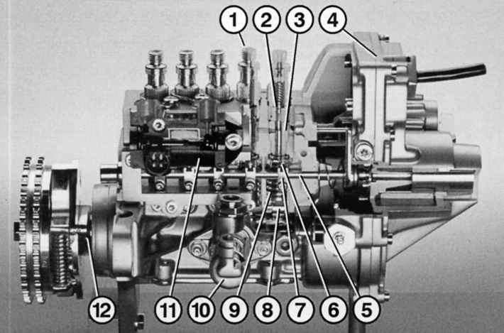 При запуске дизельного двигателя крутящий момент ведущего вала 1 передается ведомому валу 4 ТНВД через косозубое зацепление зубчатой муфты 3 и косозубую шестерню 2, ТНВД начинает работать.