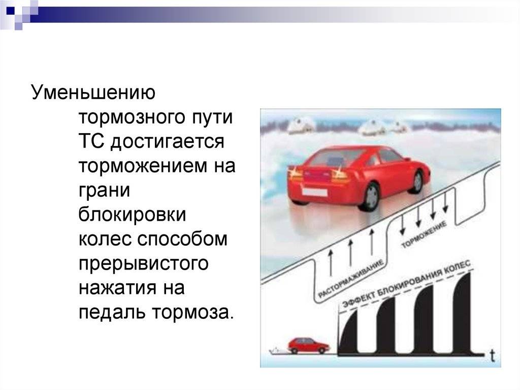Такой способ торможения обеспечивает наиболее быструю остановку, однако не дает возможности объезда препятствия во время торможения и создает риск заноса автомобиля в случае неоднородного покрытия. Придется всем этим пожертвовать ради быстрой остановки.