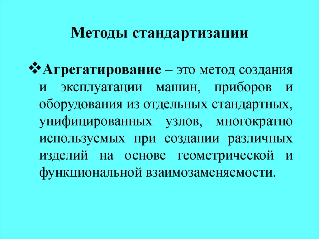 На основе унификации получило развитие агрегатирование — метод конструирования машин, приборов и других изделий из унифицированных и стандартных деталей и агрегатов (из модулей). Агрегатирование представляет