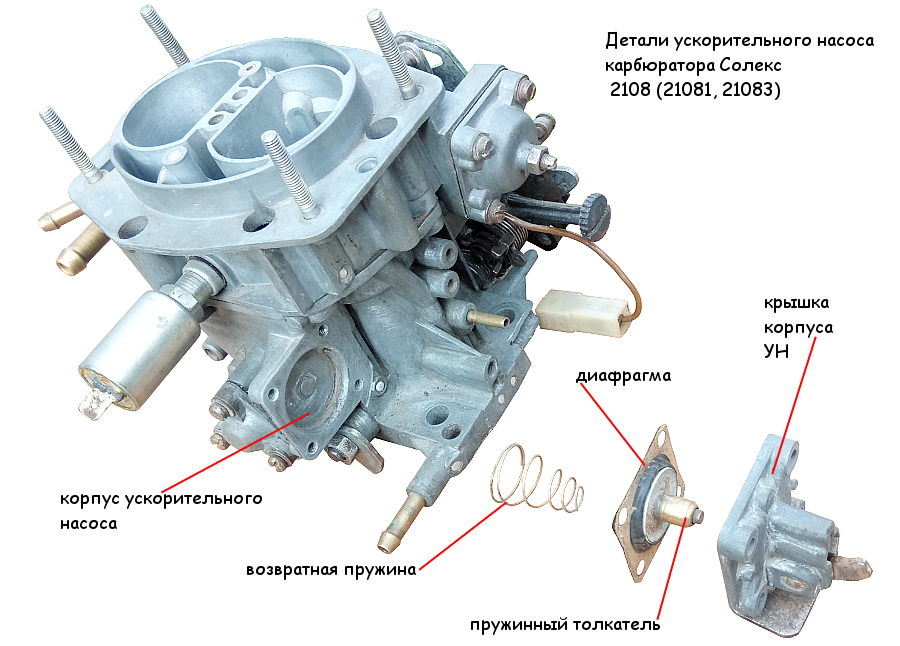Подробнее и нагляднее на схемах: «Принцип действия ускорительного насоса карбюратора Солекс 21073».