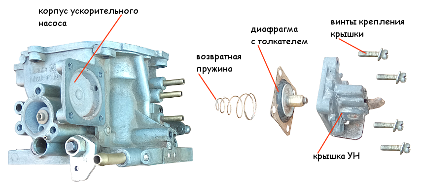 Ускорительный насос встроен в корпус карбюратора. Далее показаны видимые элементы ускорительного насоса. См. фото в начале статье и ниже.