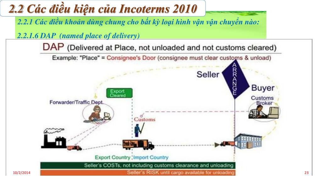 Продавец несет все риски, связанные с доставкой товара в поименованное место. Сторонам рекомендуется наиболее точно определить пункт в согласованном месте назначения, поскольку риски до этого пункта несет продавец. Продавцу рекомендуется обеспечить договоры перевозки, в которых точно отражен такой выбор. Если продавец по его договору перевозки несет расходы по разгрузке в согласованном месте назначения, продавец не вправе требовать от покупателя возмещения таких расходов, если иное не согласовано сторонами. DAP требует от продавца выполнения таможенных формальностей для вывоза, если таковые применяются. Однако продавец не обязан выполнять таможенные формальности для ввоза, уплачивать импортные пошлины или выполнять иные таможенные формальности при ввозе. При намерении сторон возложить на продавца выполнение таможенных формальностей для ввоза, уплату любых импортных пошлин и выполнение иных таможенных формальностей для ввоза, целесообразно использование термина DDP.