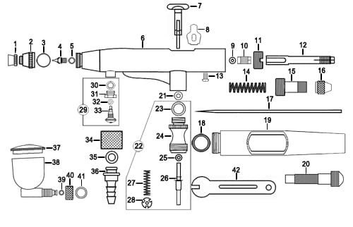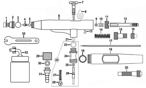 С виду небольших размеров прибор для распыления краски может включать в себя более 20 элементов, обеспечивающих его качественную работу. Чтобы понять устройство аэрографа, достаточно взглянуть на рисунок, приведенный ниже, где показан инструмент в разрезе.
