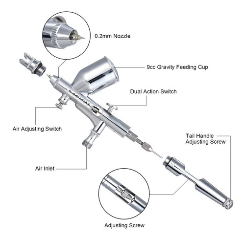 60% производительности, он также может быть стабильным после длительного использования. так что вы можете использовать его для выполнения многих профессиональных потребностей. - Комплект аэрографа двойного действияКомпрессор аэрографа поставляется с высокопроизводительным аэрографом двойного действия. Вырезная рукоятка аэрографа позволяет быстро промывать и очищать воздушные каналы, а ручка управления подачей жидкости обеспечивает легкую регулировку триггера и контроль подачи краски. Входящее в комплект сопло 0,2 и 0,5 мм позволяет использовать этот чрезвычайно универсальный аэрограф для распыления очень мелких деталей, общего распыления или для распыления фона шириной 2 дюйма.
