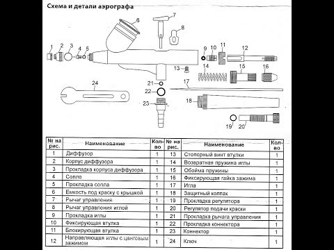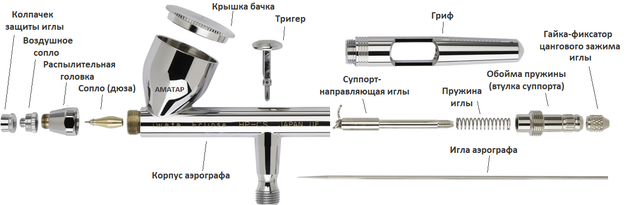 Для того, чтобы правильно пользоваться и ухаживать за инструментом, необходимо понимать, как он устроен. Конструкция его достаточно хрупка, и потеря хотя бы одной детали может привести к поломке или некорректной работе всего аэрографа.