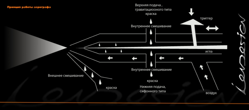 Принцип работы аэрографа заключается в следующем. После нажатия на триггер происходит открытие воздушного клапана, и воздух под давлением начинает поступать к соплу прибора и выходить из него. Поскольку аэрограф работает от проходящего через корпус прибора сжатого воздуха, давление которого выше, чем давление внешней среды, то краска поднимается из бачка и смешивается с ним.