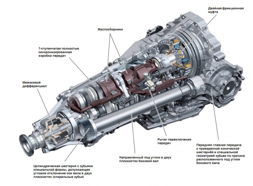 Внутреннее устройство «робота» «DSG» подразумевает использование нескольких взаимосвязанных частей: маховика, двойного блока сцепления, пары передаточных рядов, главной передачи и дифференциала, а также управляющей системы. Данные части находятся внутри картерной оболочки.