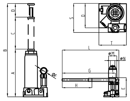 Итак, гидравлический домкрат бутылочного типа. Он состоит из вертикального корпуса большого диаметра и примыкающего к нему маленького цилиндра, к штоку которого подходит съемный рычаг. Корпус установлен на опорной площадке, в штоке у него часто есть винтовой удлинитель, который необходим для того, чтобы увеличить высоту подъема. Два цилиндра соединены между собой, через обратный клапан.