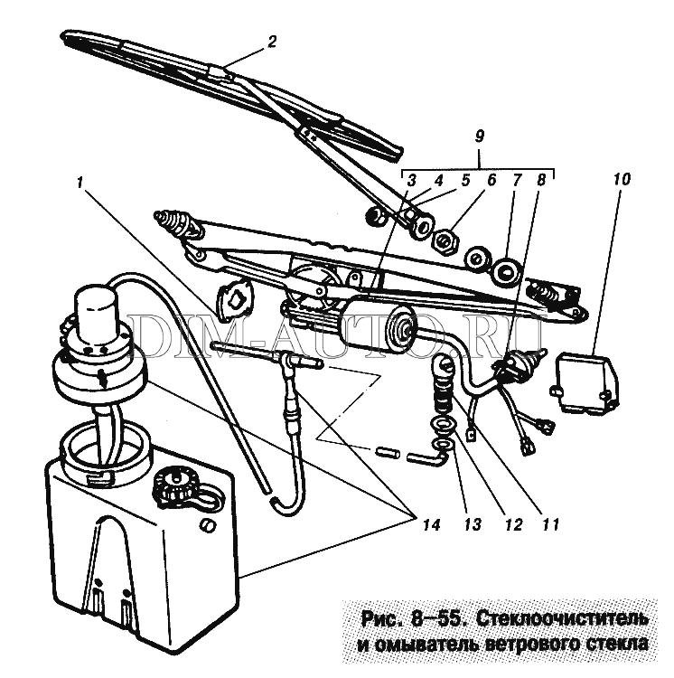 Схема системы очистки стекла для ПриорыСистема стеклоочистки состоит из таких элементов: