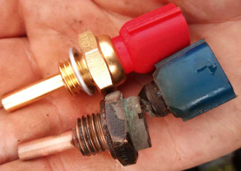 Если все таки не выходит устранить такую утечку жидкости , то в таких вариантах следует переустановить датчик температуры, при том что большая часть герметика желательно термостойкого наносится на резьбовую часть краников или можно поменять медную шайбу. - Когда датчик охлаждающей жидкости достигает определенной температуры он закрывается или открывается, измерить его можно также вольтметром и поймать эти резкие колебания в напряжении во время прогрева датчика охлаждающей жидкости.