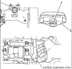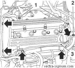 Для снятия верхней крышки привода ГРМ необходимо отпустить крепежные болты (1) (двигатели Z16XE/Z18XE) |
