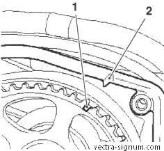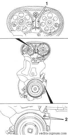 6.7 Выставление ВМТ (двигатели Z16XE/Z18XE) — метки (2) шкива коленчатого вала и метки (1) зубчатых колес распределительных валов должны совпасть |