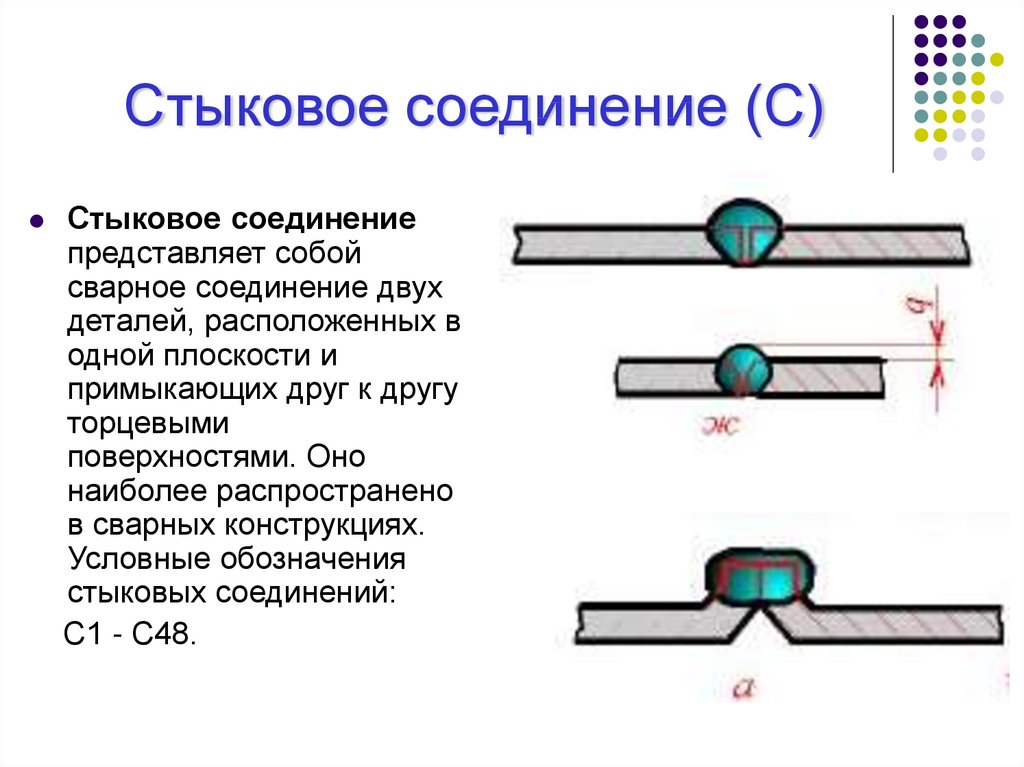 - Стыковые сварные соединения (Рис. 1, а) – свариваемые элементы располагаются в одной плоскости или на одной поверхности. Устанавливается 32 вида стыковых соединений. Обозначаются С1, С2, С3, С4 и т.д.