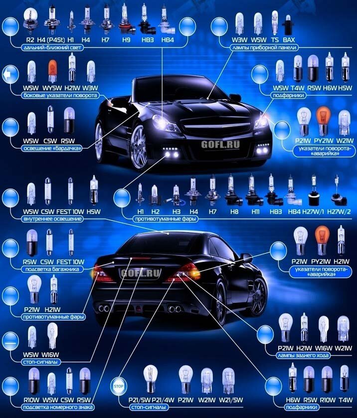 В современном автомобиле применяется огромное количество ламп. Они выполняют функции внешнего и внутреннего освещения. В зависимости от этих целей, лампы также имеют разные габариты, электрические характеристики, соединительный цоколь.
