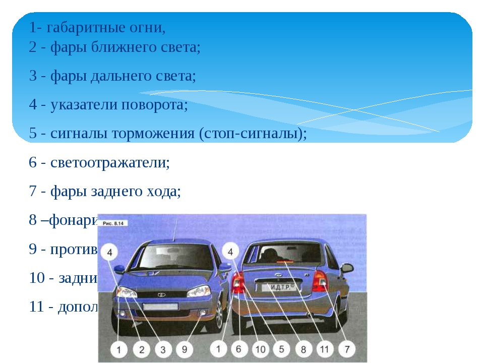 Передняя фара объединяет, как правило, несколько приборов освещения в одном корпусе: фара ближнего света, фара дальнего света, габаритный фонарь, фонарь указателя поворотов, дневные ходовые огни (при наличии). Объединенная конструкция носит название блок-фара . Основными световыми приборами в ней являются фары ближнего и дальнего света. К передним фарам относятся и противотуманные фары, которые устанавливаются отдельно.