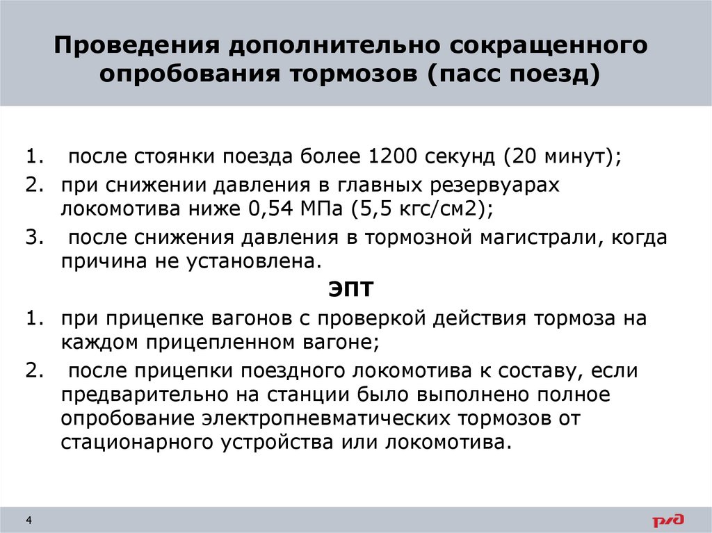 Перед затяжными спусками крутизной 0,018 и круче полное опробование производится с 600 секундной (10 минутной) выдержкой в заторможенном состоянии. Перечень