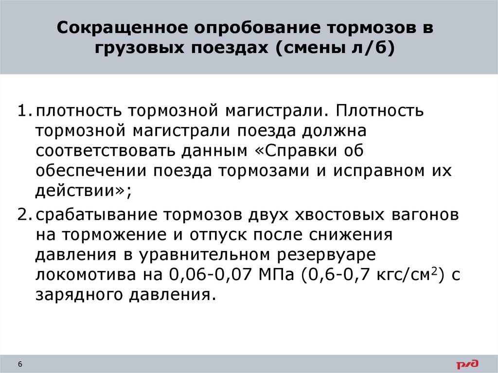 При сокращенном опробованиипроверяют состояние тормозной магистрали по действию тормозов двух хвостовых вагонов (пяти хвостовых вагонов — для длинносоставных поездов). Если сокращенное опробование выполняется после произведенного от стационарной компрессорной установки полного опробования, то машинист и осмотрщик вагонов должны проверить плотность тормозной сети поезда от локомотива.