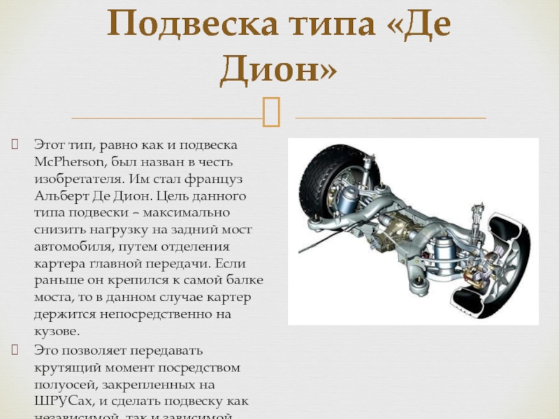 Случаи, когда автомобильная промышленность навсегда отказывается от изобретений прошлого, нечасты. Яркий пример тому – подвеска «Де Дион», названная, как и макферсон, в честь своего изобретателя, и придуманная в XIX веке еще для паровых машин. Эта подвеска (могущая быть как зависимой, так и полузависимой) была разработана для снижения неподрессоренной массы – колеса связывала система поперечных труб, а редуктор моста (чаще заднего) крепился к шасси автомобиля, облегчая вес подвески. Долгое время «Де Дион» не использовался производителями, но относительно недавно подвеской этого типа оснастили автомобили smart – как единственной, способной справиться с задачей.