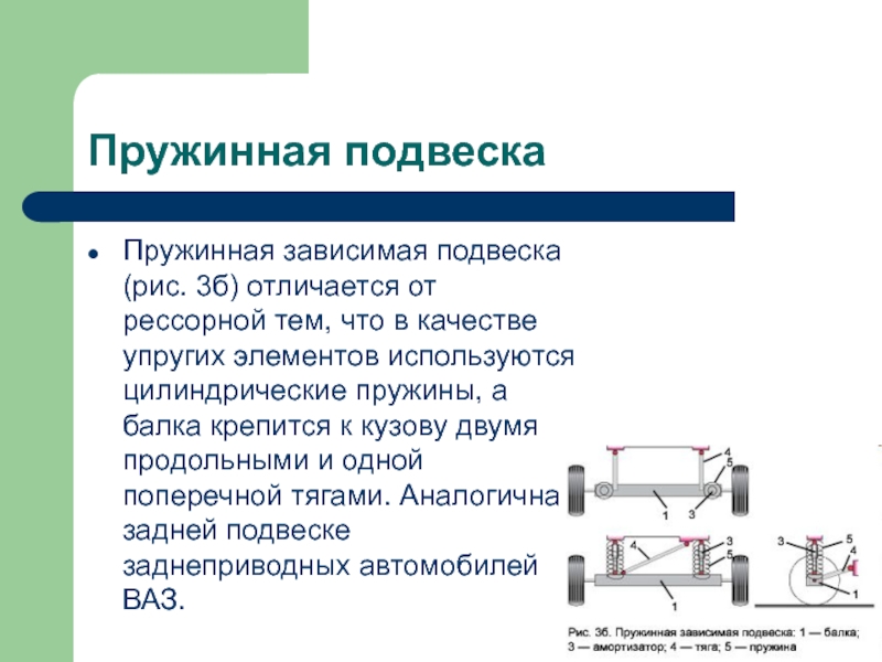 Рессора, пружина, торсион, пневмоподушка. Они ответственны за вертикальные силы, возникающие при проезде неровностей. - Направляющие элементы. Рычаг, тяга, штанга, балка. Определяют характер перемещения колес, передают моменты продольных и боковых сил.
