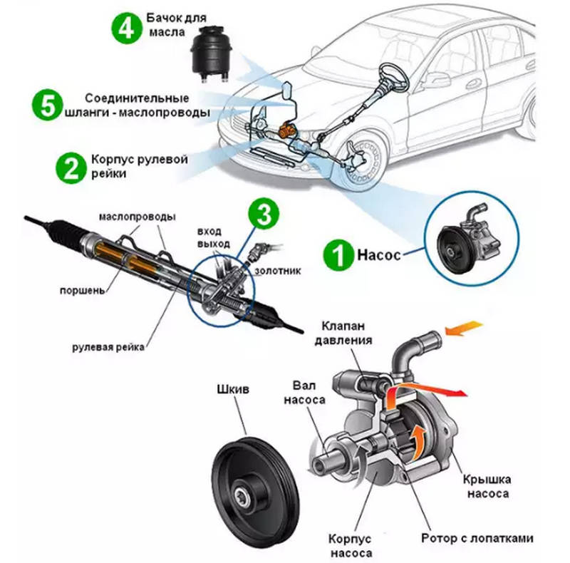 Устройство гидроусилителя руля обычно состоит из насоса, жидкости для гидроусилителя руля, соединения напорного шланга, регулирующего клапана и обратного трубопровода.