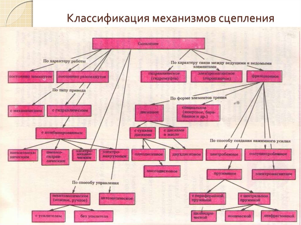 В зависимости от конструкции различают следующие типы сцепления: фрикционное, гидравлическое, электромагнитное. Фрикционное сцепление передает крутящий момент за счет сил трения. В гидравлическом сцеплении связь обеспечивается за счет потока жидкости. Электромагнитное сцепление управляется магнитным полем.