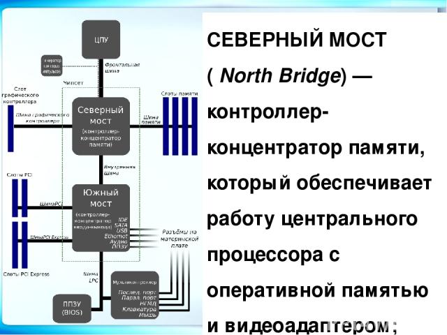 Взаимодействие между компонентами и устройствами ПК, подключенными к разным шинам, осуществляется с помощью, так называемых мостов, реализованных на одной из микросхем Chipset.