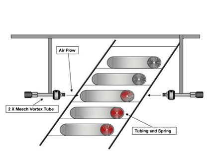 Пример Компания производит трубы с термоусадкой для автомобильной промышленности. У трубок есть металлическая пружина внутри. У них возникли проблемы с быстрым охлаждением трубки из-за тепла, удерживаемого пружиной. Они используют вихревую трубку для проталкивания воздуха через трубку, чтобы сократить время охлаждения и увеличить производительность.