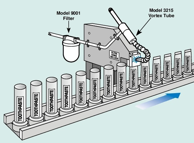 Пример: Компания использует сварку для соединения кухонной бумажной упаковки. Когда ультразвуковой аппарат используется в течение длительного времени, выделяемое тепло может привести к перегреву пистолета. Это приводит к дорогостоящему простою машины. Базовая вихревая трубка была установлена на ручном сварочном пистолете с выходом, направленным на кончик пистолета. При одновременном использовании вихревой трубки и ультразвуковой сварки наконечник быстро остывает, тем самым предотвращает перегрев и ненужные простои.