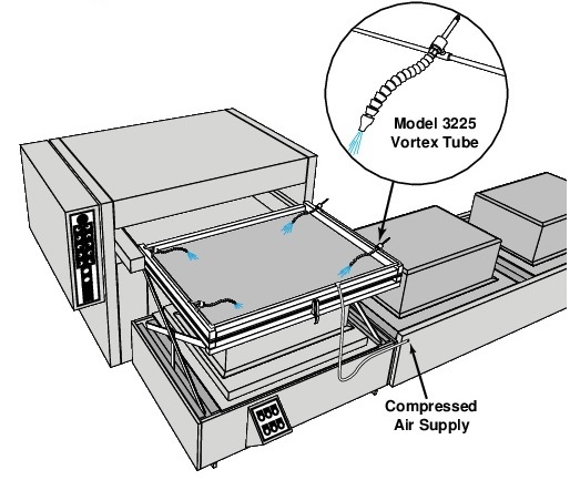 Решение: вихревые трубки использовались для подачи холодного воздуха на детали после цикла пайки. Вихревые трубки были настроены на 80% холодного воздушного потока (холодная фракция), чтобы обеспечить максимальное охлаждение. Детали охлаждали от температуры пайки 788 ° C до температуры обработки 49 ° C в течение 20 секунд, что позволяло машине работать с максимальной производительностью.
