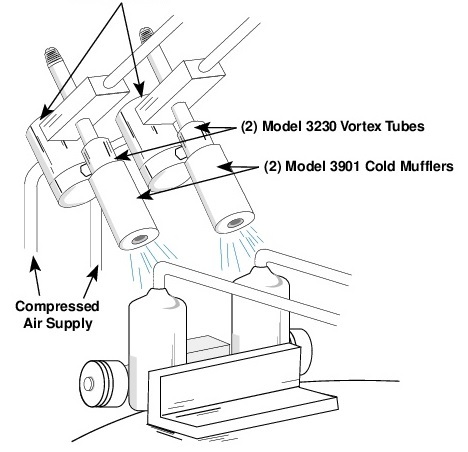 Комментарий: Трудно представить приложение, лучше подходящее для вихревого охлаждения, чем это. Небольшие размеры и легкий вес вихревых трубок упрощают монтаж на стойке охлаждения. Отсутствие движущихся частей гарантирует надежность и не требует технического обслуживания в агрессивной среде. Наконец, поток холодного воздуха легко направлялся в топливный бак.