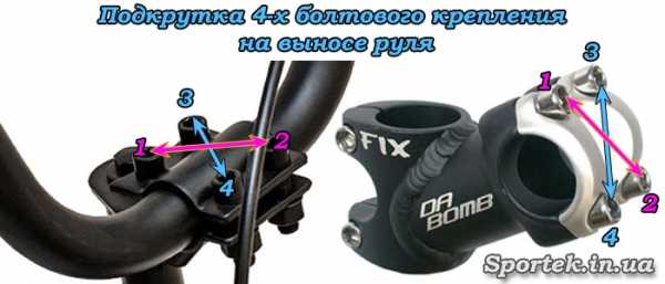 Да, небольшой нюанс. Если руль велосипеда крепиться в выносе 4-мя болтами (часто это на детских и подростковых моделях), то их лучше подкручивать по очереди, по диагонали, как показано на рисунках.