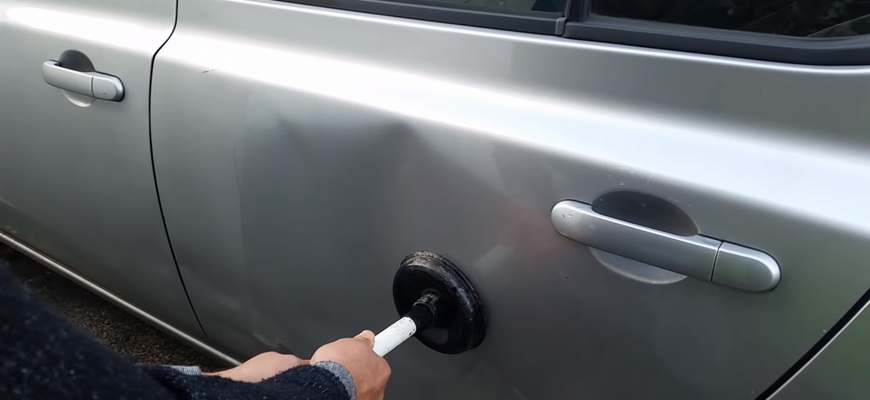 Выправить вмятину своими руками можно с помощью небольшого рычага, благодаря которому совершается давление на внутреннюю поверхность поврежденной детали. Делается это через специальные отверстия, если же этот метод не приносит желаемого результата – удаление вмятин можно провести с использованием специальных присосок и минилифтеров.