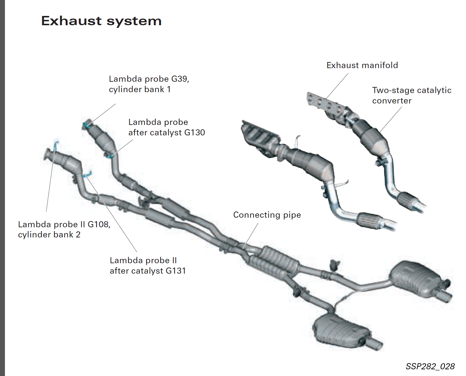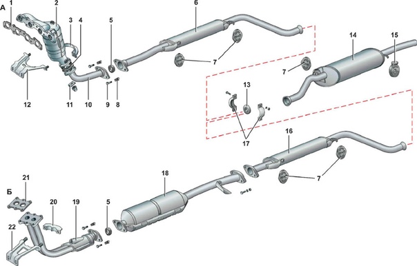 В систему входят несколько основных элементов, в числе которых каталитический нейтрализатор, глушитель, соединительные трубки и сажевый фильтр (устанавливается только на автомобилях с дизельными двигателями).