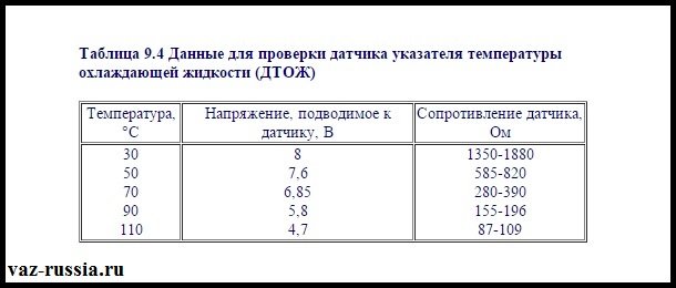 Для общего понимания какие значения выдает датчик при разных температурах, как пример, ниже приведены данные для ВАЗ-2110. Показания других легковых машин сильно отличаться не будут.