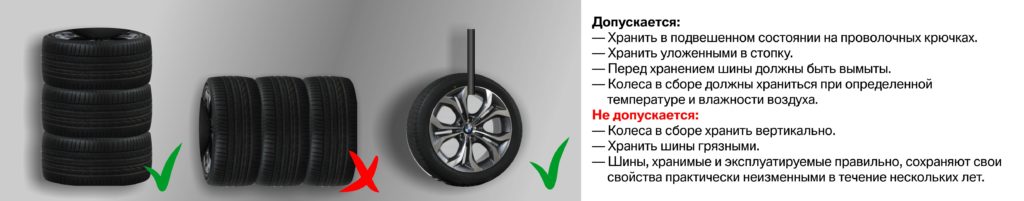 Надетую на диск шину, или колесо в сборе, нельзя ставить. Для того чтобы избежать деформации протектора под действием силы тяжести диска и самой резины, колеса укладываются плашмя друг на друга по 2 штуки. Периодически (раз в 1-2 месяца) верхнее и нижнее колесо меняют местами и переворачивают.
